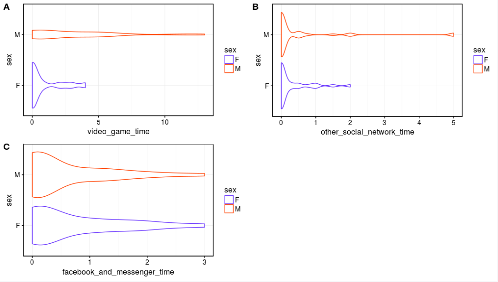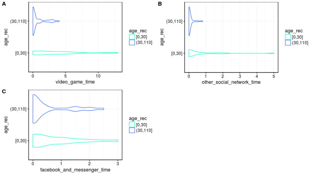 We can easily see that video game time's and other social network time's (like snapchat instagram ,...) distribution are hardly affected by the age class. Indeed young population seem to be more attracted to video game and other social network time . In comparison facebook seem to be nearly the same distribution for the two age classes facebook seem to be popular not only about young poeple but also about all the other.