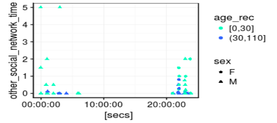 Here we do not see any relation too. Despite that we can see that the hightest value go to bed later than the other but it is not enough to say that a true relation exist and we can say that social networks seem not to affect bed time habits